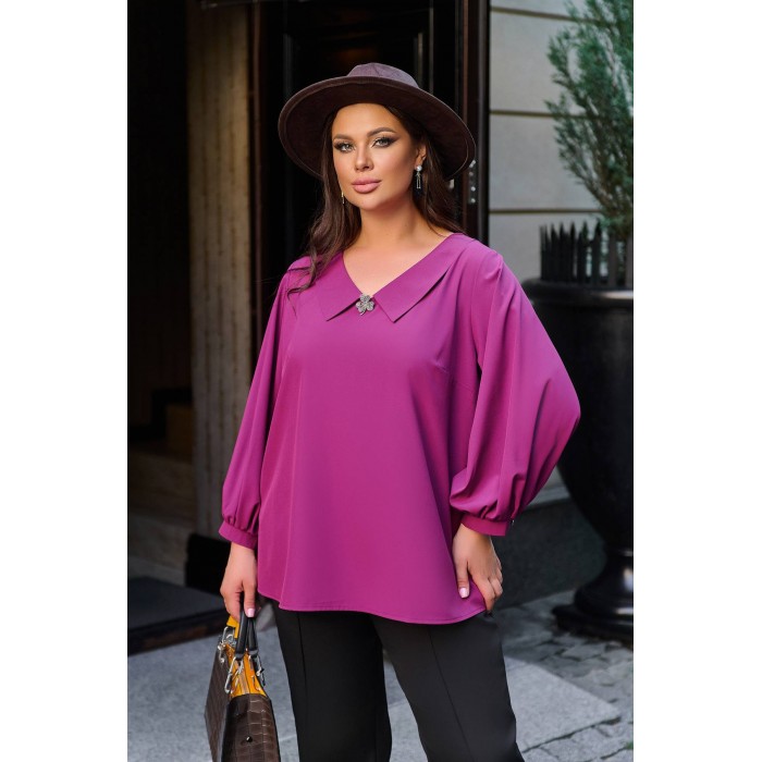 Опис: Ніжна ошатна блуза вільного силуету з широкими рукавами під манжети. V-подібний виріз оздоблений декоративним відкладним комірцем та маленькою елегантною брошкою.